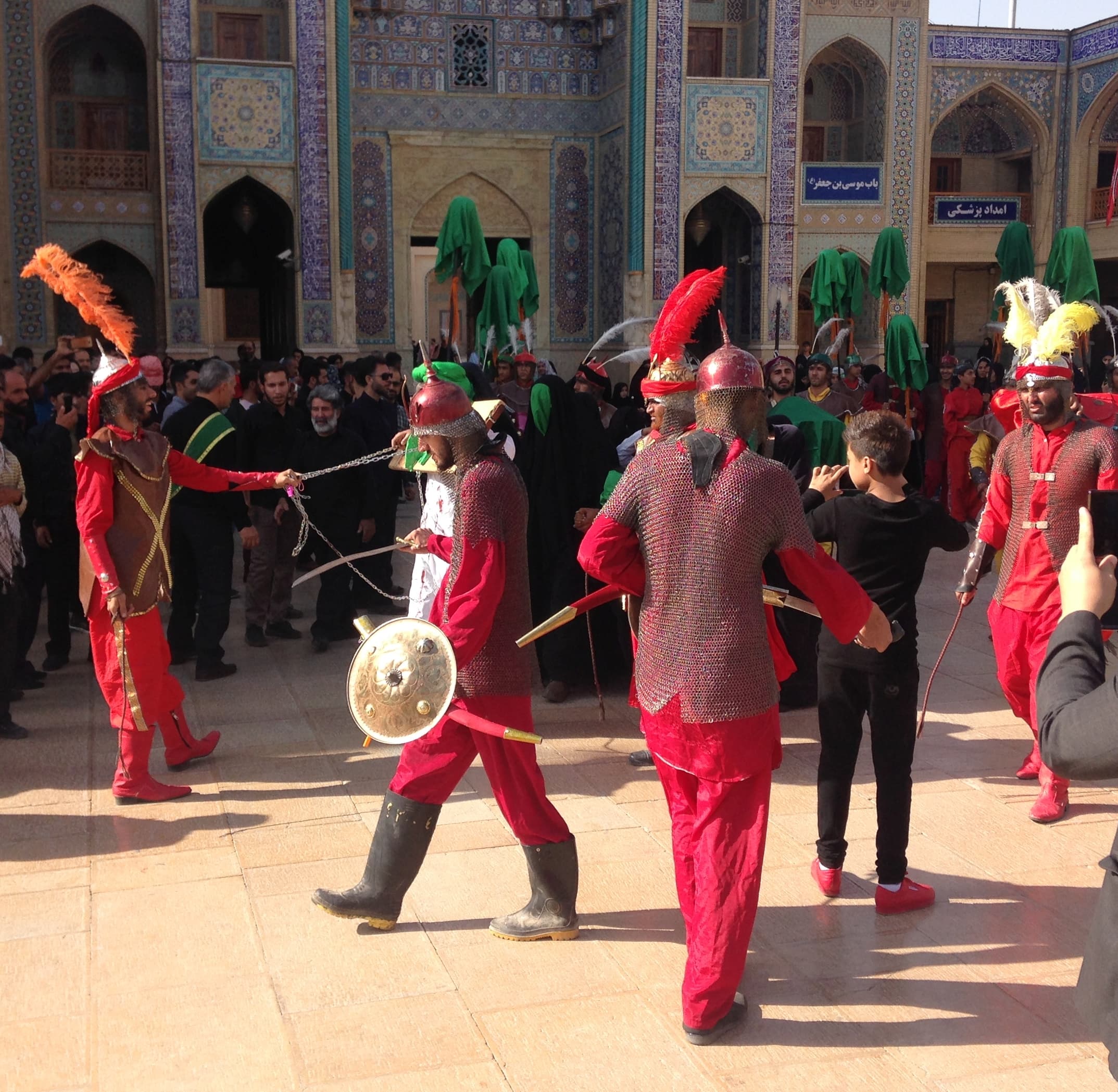 Rund um diesen hohen schiitischen Feiertag wird das Geschehen nachgespielt – ähnlich unseren Passionsspielen: in Rot die Truppen der Sunna unter ihrem Kalifen Yazid, in Grün der Enkel des Propheten Mohammed, Hussein, mit seinen Gefährten. Und da es sich nicht geziemt, Hussein bildlich zu zeigen, sind seine Augen durch Fransen verdeckt. Lautstark wird die Geschichte erzählt. Und man sieht den Darstellern an, dass sie sich in die Kampfszenen geradezu hineinsteigern. Nach etwa zwei Stunden ist die ungleiche Schlacht geschlagen, sind die Nachkommen des Propheten besiegt, bis auf einen – damals kranken – Sohn Husseins tot. Aber: die Dynastie lebt fort bis zum 12. Imam, dem Mahdi, der im Verborgenen lebt und am Tag des Jüngsten Gerichts wiederkehren wird. Der oberste geistige Führer der Schia beansprucht, ihn auf Erden zu vertreten – Tradition, Geschichtsbewusstsein und heutige Politik gehen Hand in Hand.