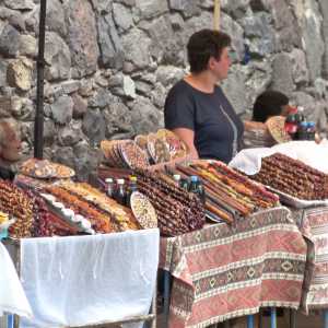 Armenische Spezialitäten: Gata, ein süß gefüllter Kuchen, und Tschurtschchela, eine Spezialität aus Walnüssen und eingekochtem Traubensaft, der wir in Georgien wieder begegnen werden. -